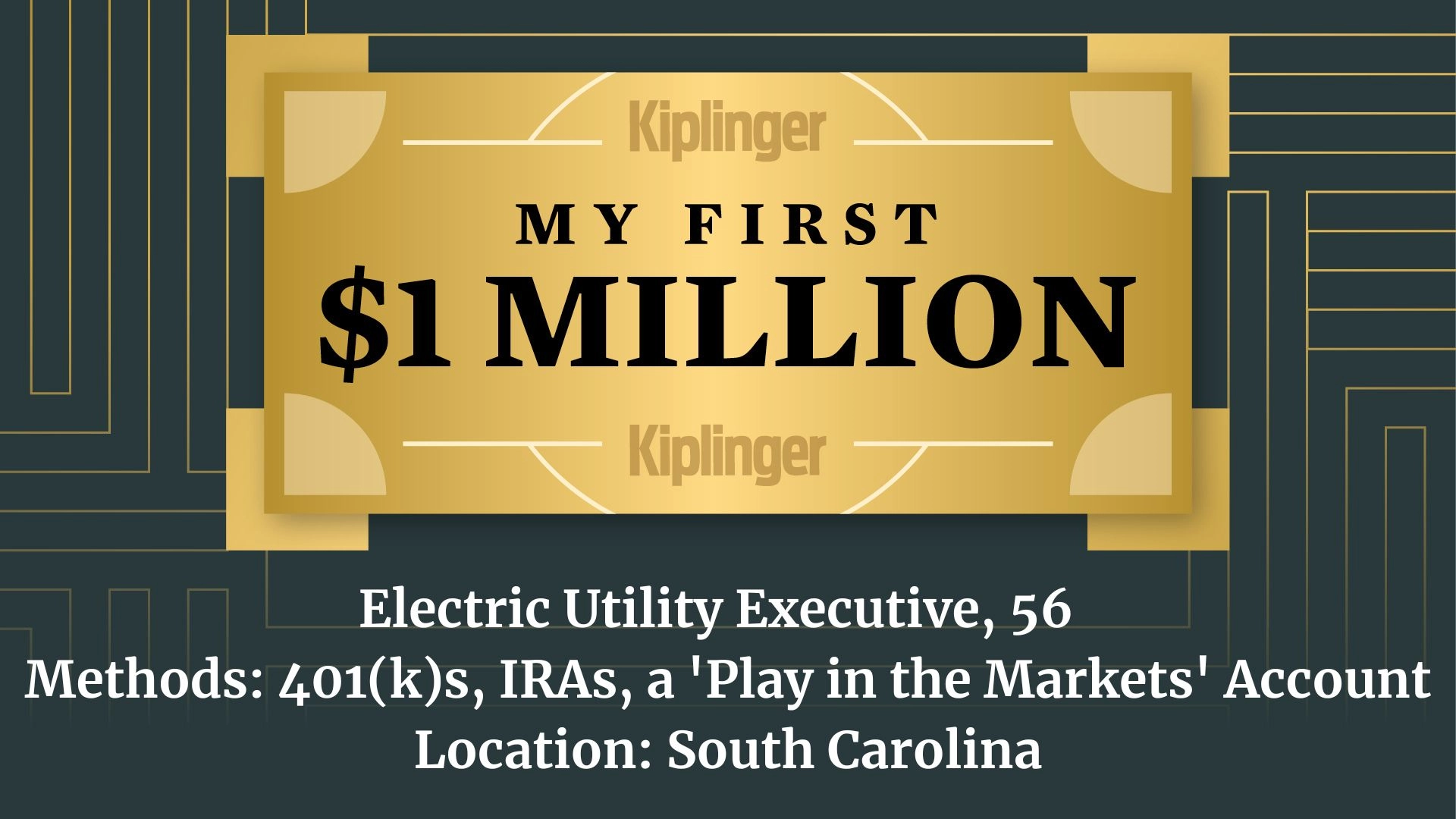 Welcome to Kiplinger's My First $1 Million series, in which we hear from people who have made $1 million. They're sharing how they did it and what they're doing with it. This time, we hear from a 56-year-old married high-ranking executive at an electric utility in South Carolina.